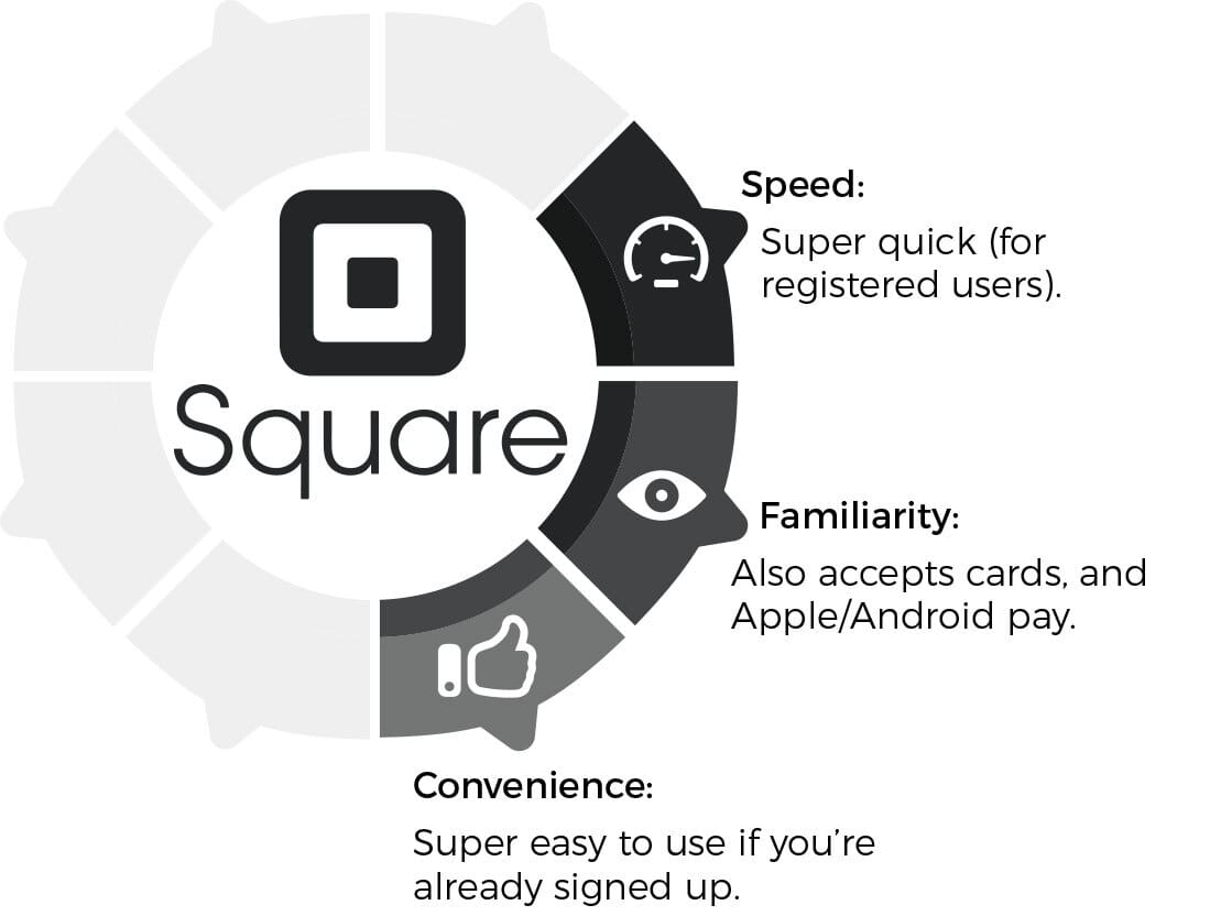 Convenience: The Square “Cashtag” is super mobile friendly and easy to use, if you’re already signed up.Speed: Just like Venmo, if you’re a Square user and have square cash it’s really pretty fast once you give them your link (cash.me/$wackychad). (no device)Familiarity: Can also accept credit/debit cards, Apple/Android pay, & chip cards. (device)