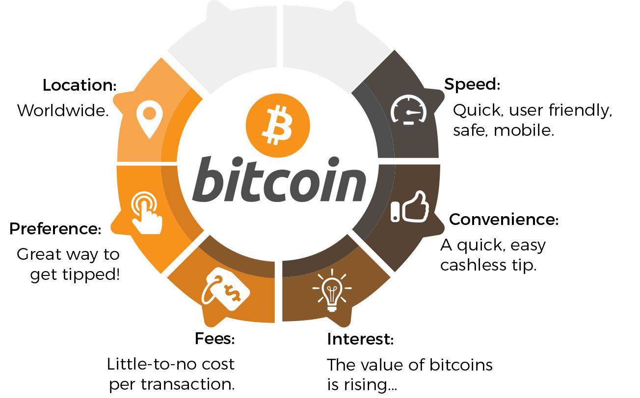 Preference: My absolute favorite way to get tipped!Convenience, speed: Quick, efficient, user friendly, safe, mobile, easy-to-useLocation: WorldwideFees: Little feesInterest: At the moment, the value of bitcoins is rising. So, if you get paid with Bitcoin and keep it in your Bitcoin wallet, you could end up making more than the tip amount.Digital: Think Digital Cash! Just like cash, but you don’t have to carry anything. Perfect for storing, and traveling with your cash.Convenience: If this ends up being the currency of the future it’s actually the easiest, quickest and very simple cashless tip.Modern: Used also as a joke, “of course I’m able to accept credit cards, I’m a step ahead and I accept bitcoin”.