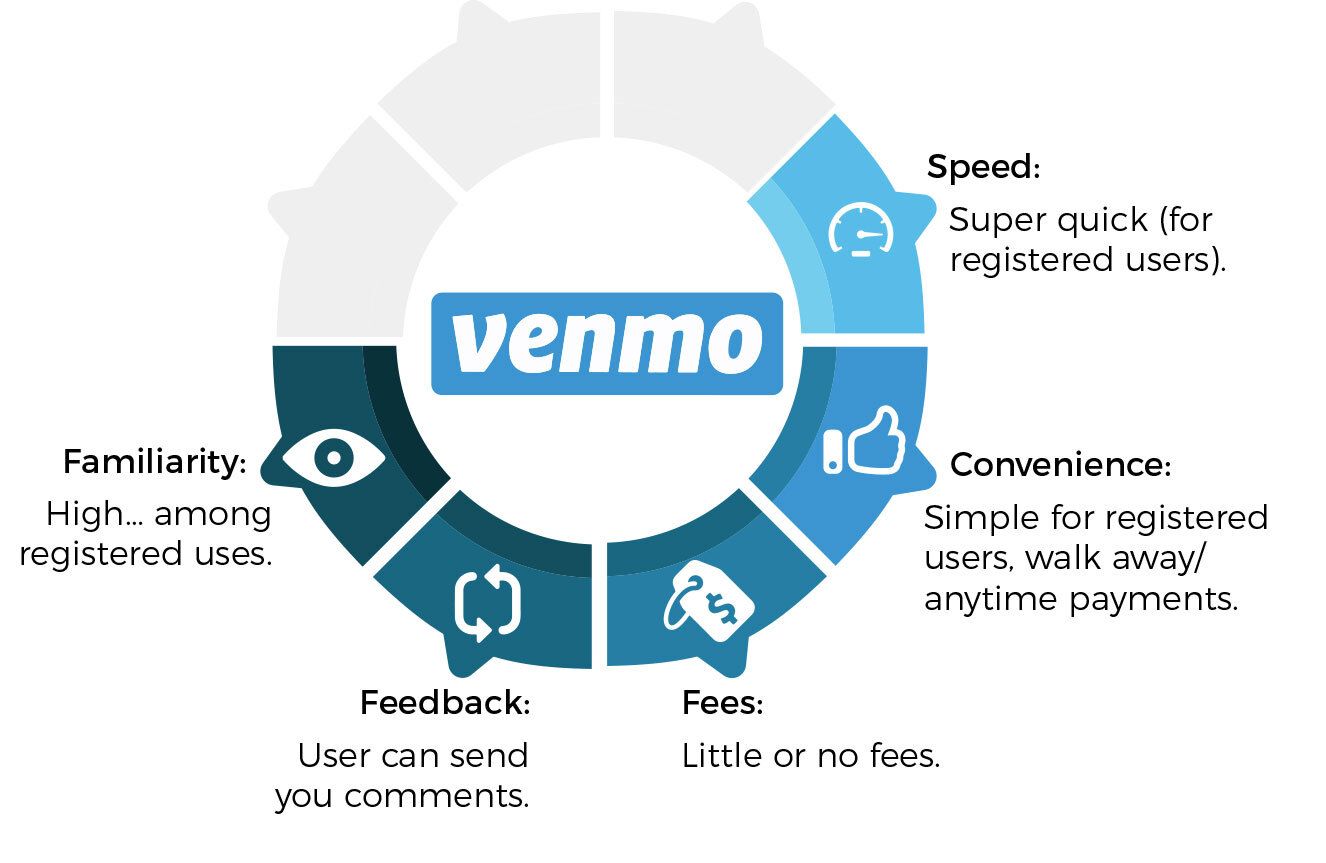 Fees: Little or no feesSpeed: Super quick (for registered Venmo users)Convenience: Simple for registered usersFamiliarity: The people that do have it, use it all the time, know how and are very comfortable using it.Feedback: User can send comments to you too.Convenience: Walk away/anytime payments.