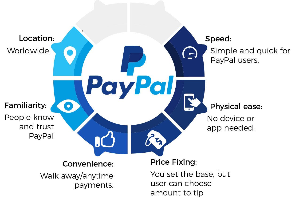 Convenience: Walk away/anytime payments.Familiarity: Most people either have PayPal or know what it is.Versatility: Can accept Credit/Debit Cards without being a registered member.Speed: Simple and quick for PayPal users.Trust: People trust PayPal.Price Fixing: You can set the base amount, but the user can also enter the amount to tip.Physical ease: No device needed if you use just link/donate button.