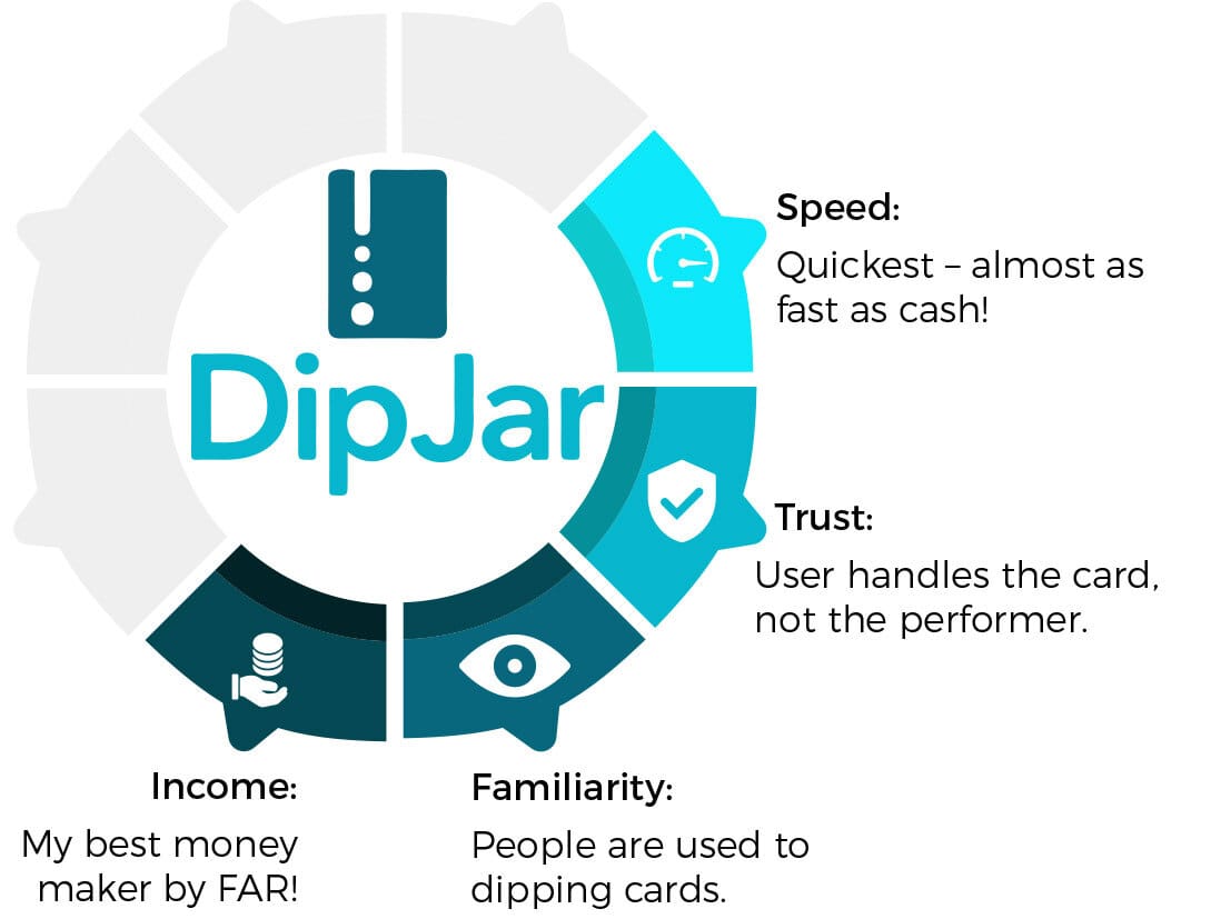 Location: This works in the USA only.Price Fixing: You set an amount before the tip collecting process, so all “dips” are the value you set it at, not the value the tipper has chosen.Fees:$400 to buy the dipjar, +$39 annual rate, + 17c +3% per transactionWeight: Device to carry. Also requires 2.4v USB battery or plugin.Extra weight: Works best set on table.Trust issue: Some people are wary of dipping their cards (but lots of people DO trust it).Physical Issue: Hard to see the amount it’s set to if the LED display is in the sun (but this problem can be fixed by adding a sticker with an amount on it).Functionality issues: Cards only go in one way. Also, sometimes the card doesn’t swipe, and you have to make sure it worked; I’ve lost a good number of tips because of this.Payouts: You get paid out weekly/bi-weekly or monthly.