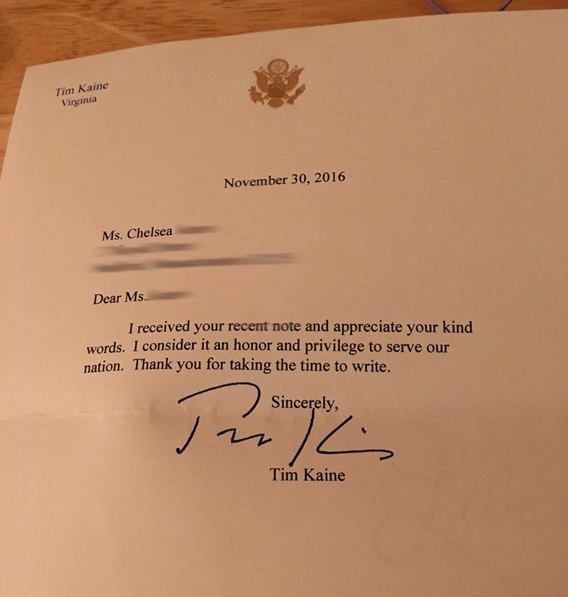 And then I felt awful at my own entitlement. Kaine was coming back from a contentious presidential campaign as a member of the minority party, and he had to invest his energy in representing his people and leading the Democratic Party forward. Answering a letter from someone who wasn’t one of his constituents – no matter how charming and unique the letter was – couldn’t be a priority in a time of panic.