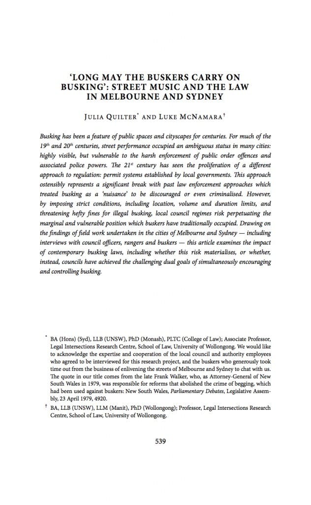 Researchers from the University of Wollongong and the University of New South Wales have completed the first study of the impact of busking laws in Australia. Associate Professor Julia Quilter and Professor Luke McNamara have combined close analysis of the rules and regulations under the permit systems established by the City of Sydney and the City of Melbourne, with original fieldwork, including interviews with buskers in both cities. The main funding of their study is that it IS possible to introduce a permit system without stifling the capacity of street musicians and other performers to do their thing – including enlivening urban streets and malls and making a living. Quilter and McNamara conclude that: “On paper, the local council laws that govern busking in Australia’s two biggest cities look tough – permit requirements, time limits, and the threat of big fines if you break the rules. Hardly conducive to a thriving street music scene. But the reality is very different. The buskers we spoke to had very few complaints about being over-regulated. Gentle, education-focused enforcement by rangers and effective self-regulation by buskers are the magic ingredients.