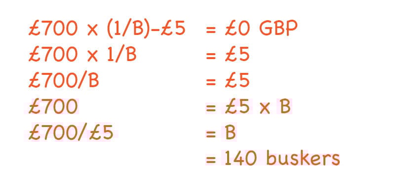 If we set the “expected value” at “0”, we can then find out how many buskers can apply (B), then the maths is: