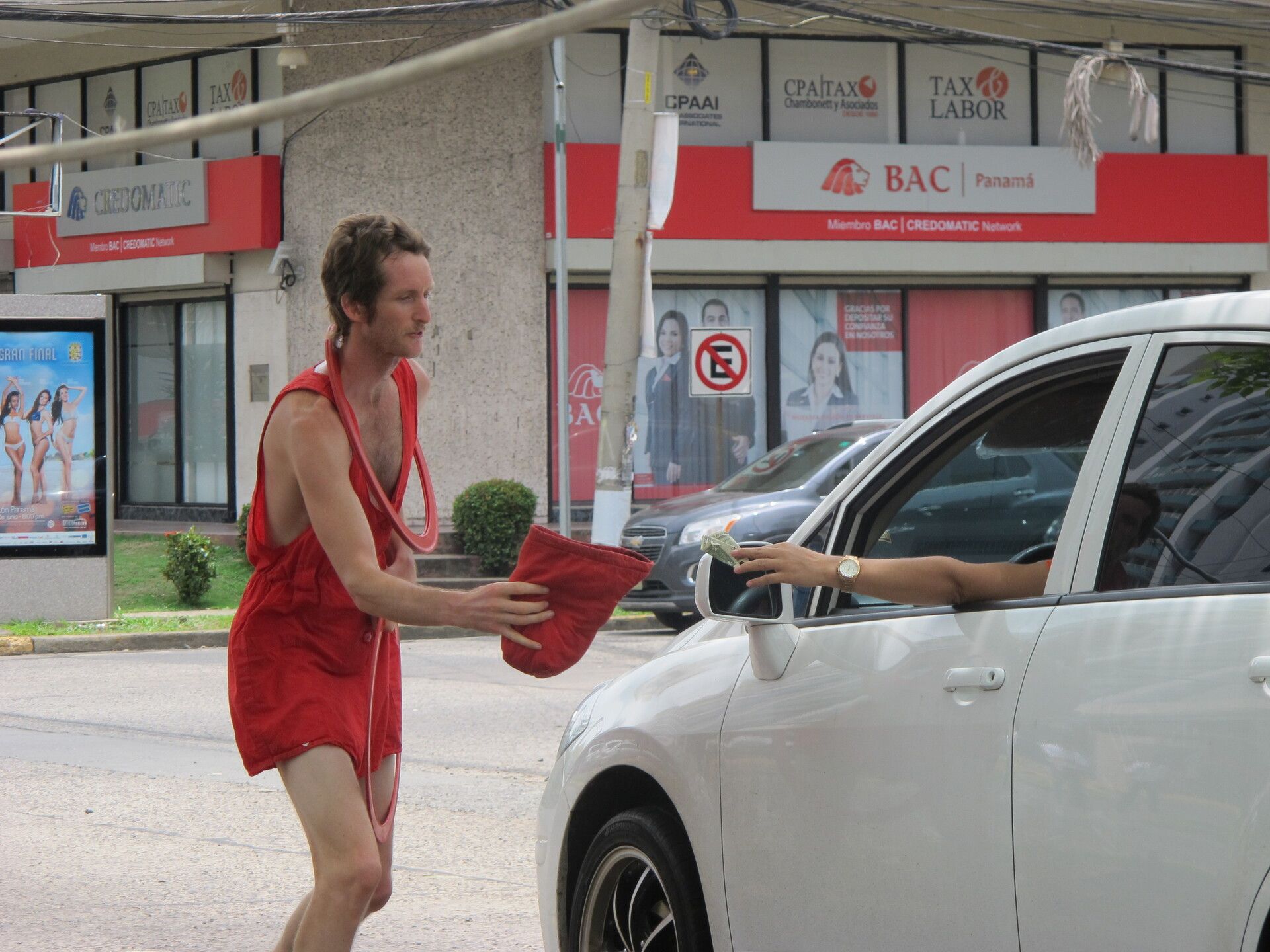 At this particular traffic light there was a man selling bouquets of flowers, another man selling the newspaper and a blind man that begged. I tied my slack rope between a couple of posts and began performing, passing the hat amongst the stationed vehicles before the light turned green. After a few traffic lights the three of them asked me to leave… this intersection was “theirs!”.