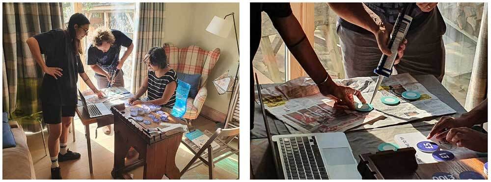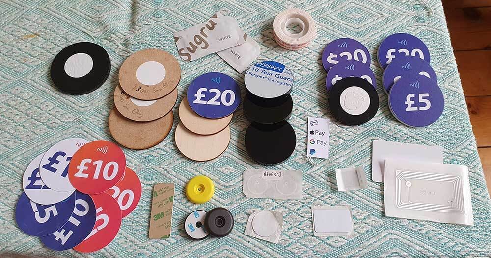 Now we had a budget for materials. So, we bought a bunch of wood, cork, acrylic and foam disks, plus a whole bunch of tags, to see which combinations had the best ‘scan range’ (how far the phone can be from a tag and still read it).