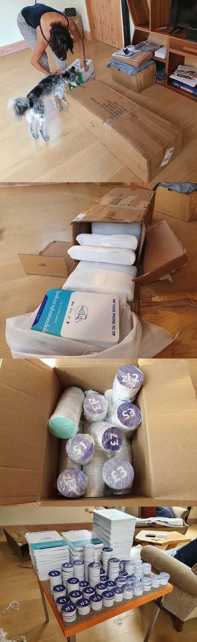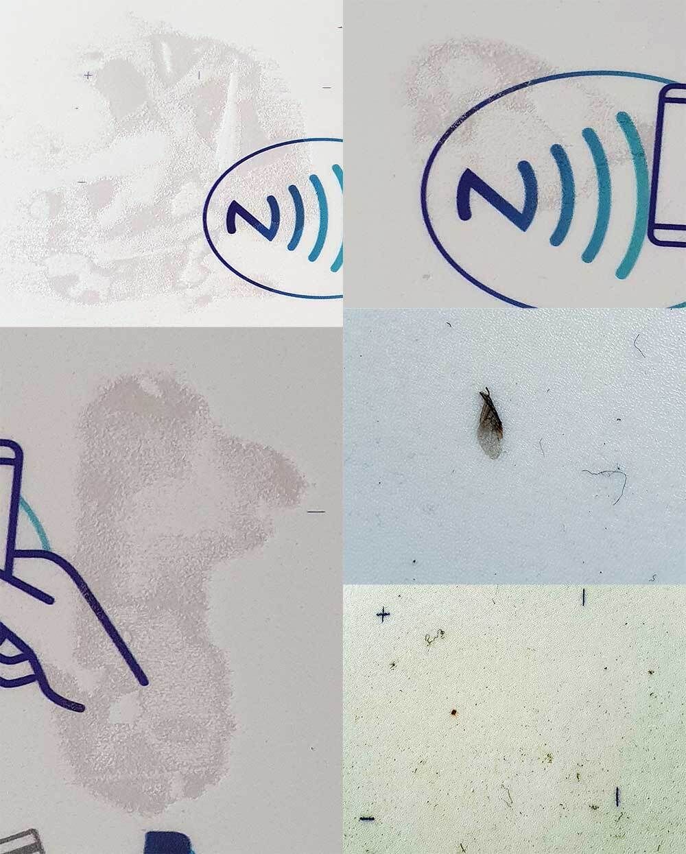 There were quite a lot of minor printing errors on the boards. We sent these photos to the factory, and they made us replacements for the worst of them (they’d had an issue with their laminating machine, and a couple of the signs had even trapped fly wings!)