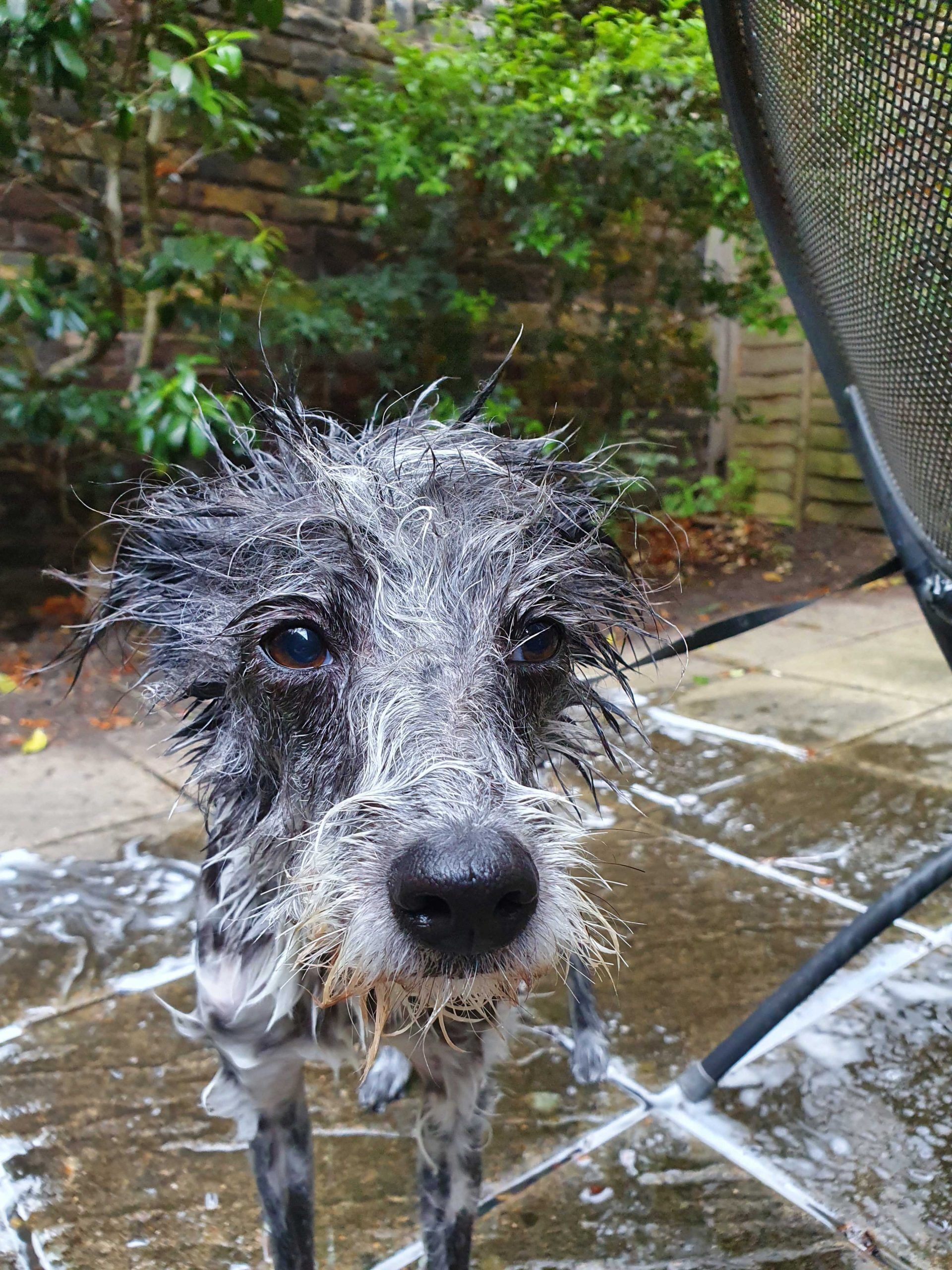 Around this time, our dog, Pisco, rolled in something he shouldn’t have, and we had to wash him. It’s not related, but what a photo: