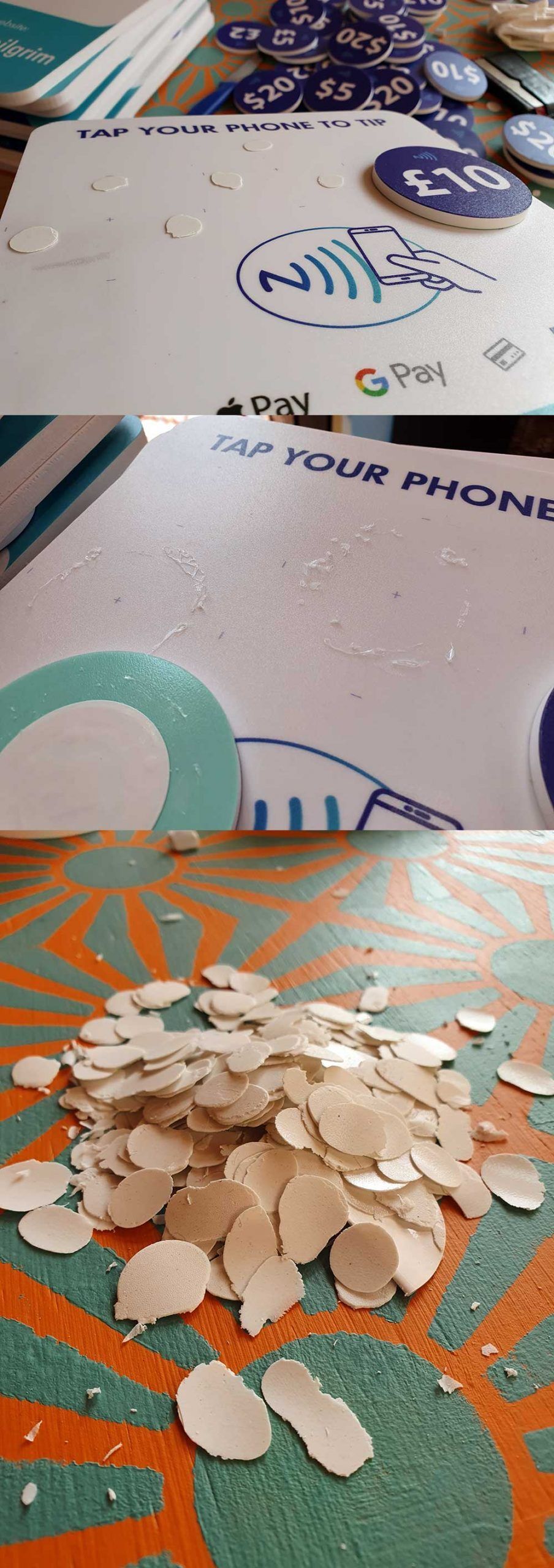 Lily decided the new designs should look as much as possible like a payment terminal, so people would instinctively know to ‘tap’ it with their phones. She then made a bunch of cutout designs we could rearrange: